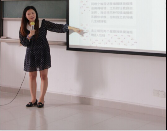 2010级新闻学专业优秀毕业生邱丽花则跟大家讲述了关于如何转变就业观念、如何提高综合素质以胜任跨专业就业,并分享了自己文职工作的心得,拓宽了大家的求职视野。