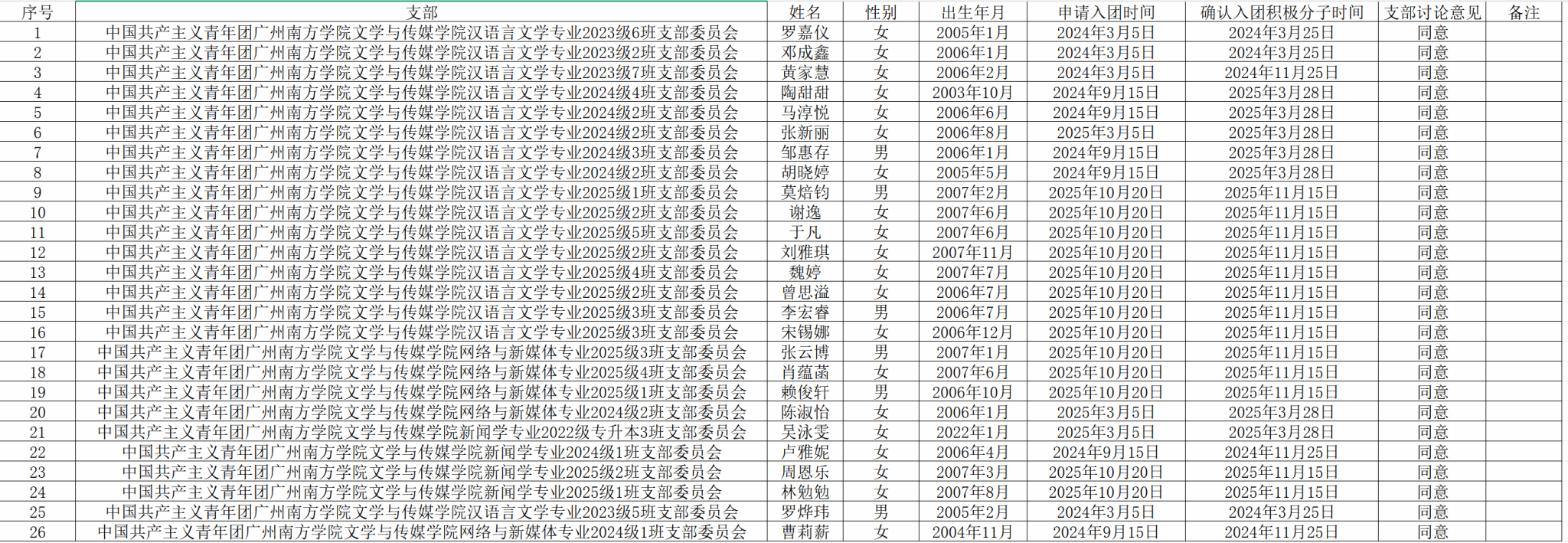 根据《团章》发展团员的相关规定,按照《中国共产主义青年团发展团员工作细则》,由青年提交入团申请,通过入团谈话、征求团员群众意见等流程,经团支部委员会讨论确定,院团委预审,推荐罗嘉仪等26名同学为2026年春季入团发展对象,现将名单公示如下: