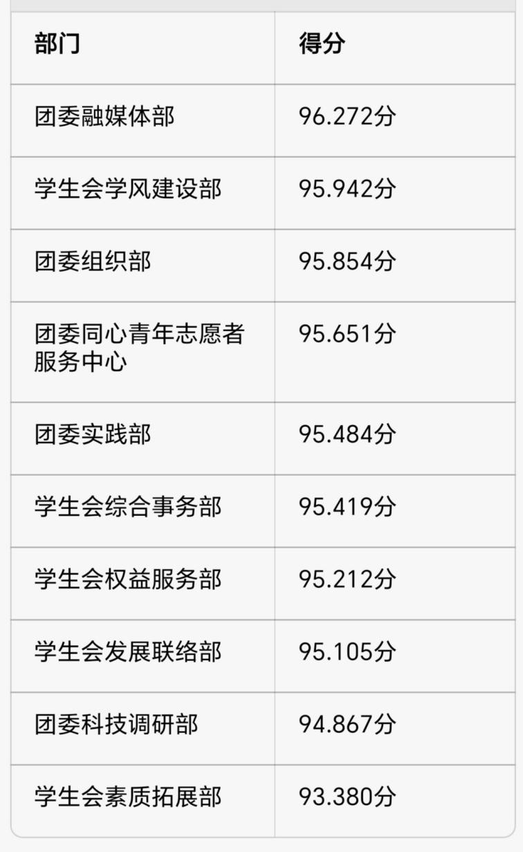 本次述职评议的最终分数由三部分构成:评议小组(60%)、团学部门干事(30%)、一级述职评议表平均分(10%)。其中,评议小组64人,共收回有效评分表58份;团学部门干事180人,共收回有效评分表119份。