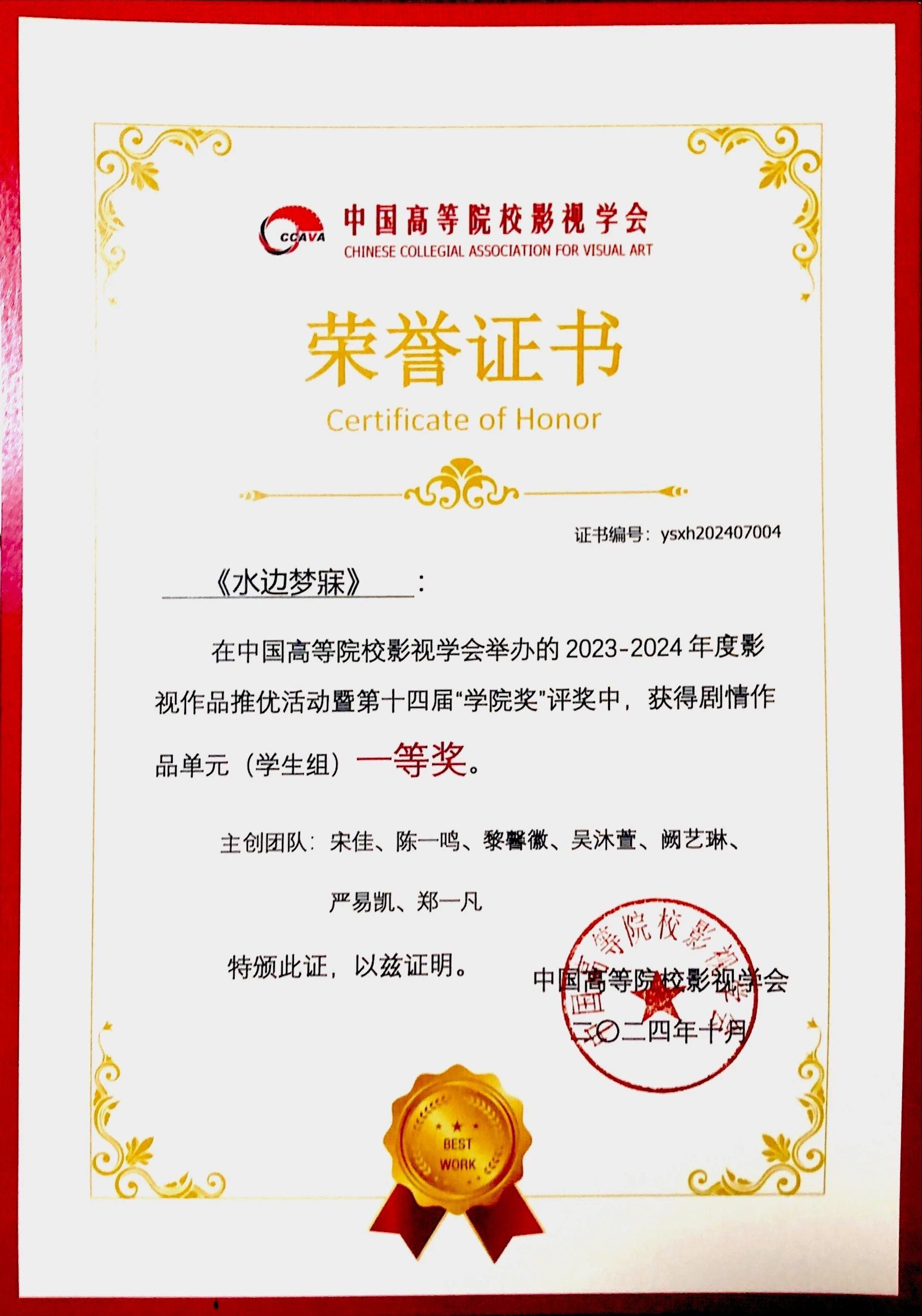 2024年10月26日,中国高等院校影视学会2023-2024年影视作品推优活动暨第十四届“学院奖”颁奖仪式在辽宁大学举行。此次影视作品推优活动的终评阶段,共有307部作品入围,其中剧情单元竞争尤为激烈,汇聚了来自北京电影学院、中国传媒大学等多所知名高校的优秀作品,共计68部。在这场高手如云的角逐中,由我院新闻与传播系邱察老师精心指导的学生团队——宋佳、黎馨徽、陈一鸣、吴沐萱、阙艺琳、严易凯、郑一凡,凭借其精心制作的剧情片《水边梦寐》大放异彩,成功斩获全国一等奖。此次一等奖在全国范围内仅评选出5个名额,而我院作品占据其中一席,这充分彰显了我院学生的卓越创作才能与不屈不挠的拼搏精神。