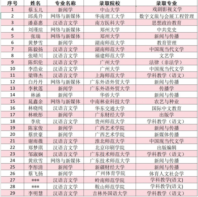 据统计,29人被境内高等院校录取,录取院校如中山大学、华南理工大学、郑州大学、上海师范大学、湖南师范大学、广州大学等,录取信息如下: