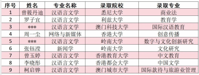 还有9人被境外高等院校录取,录取院校如悉尼大学、利兹大学等,录取信息如下: