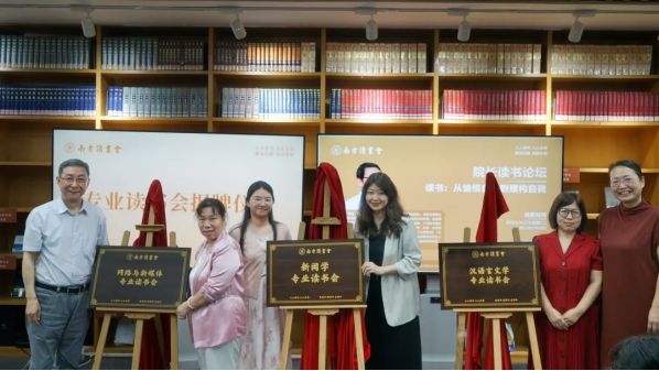 活动中,龚鸣副校长、文传学院院长孙立教授、文传学院中国语言文学系主任周凤玲教授、网络与新媒体主任系胡美香教授、新闻与传播系主任陈珂副教授等共同为三个专业的读书会揭牌。专业读书会负责本专业阅读推广工作,通过向同学推荐专业阅读书目,组织开展阅读分享活动,助力专业人才培养与同学成长。