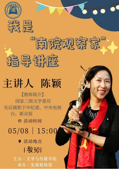 为了给“我是南院观察家”参赛选手、广大新闻爱好者以及希望提升新闻稿写作能力的同学们提供一个学习与交流的平台,“我是南院观察家”推出新闻写作指导讲座。本次讲座的主讲嘉宾是英国威廉集团陈颖老师,她将与同学们分享自己多年来的新闻稿写作经验,从选题、构思、撰写到发布,全方位解析新闻稿的写作要点和技巧。