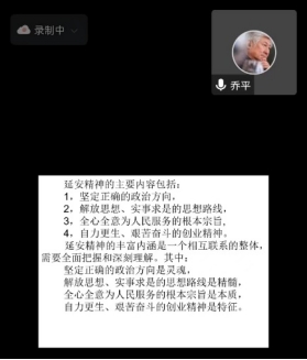 乔平老师从新的角度出发,解读党的二十大精神,通过讲述共产党领导人在延安的经典历史故事和孕育的书法作品代表的重大史实,特别强调共产党人要继承和发扬延安精神,其丰富内涵是一个相互联系的整体,需要全面把握和深刻理解。其中坚定正确的政治方向是灵魂,解放思想、实事求是的思想路线是精髓,全心全意为人民服务的根本宗旨是本质,自力更生、艰苦奋斗的创业精神是特征