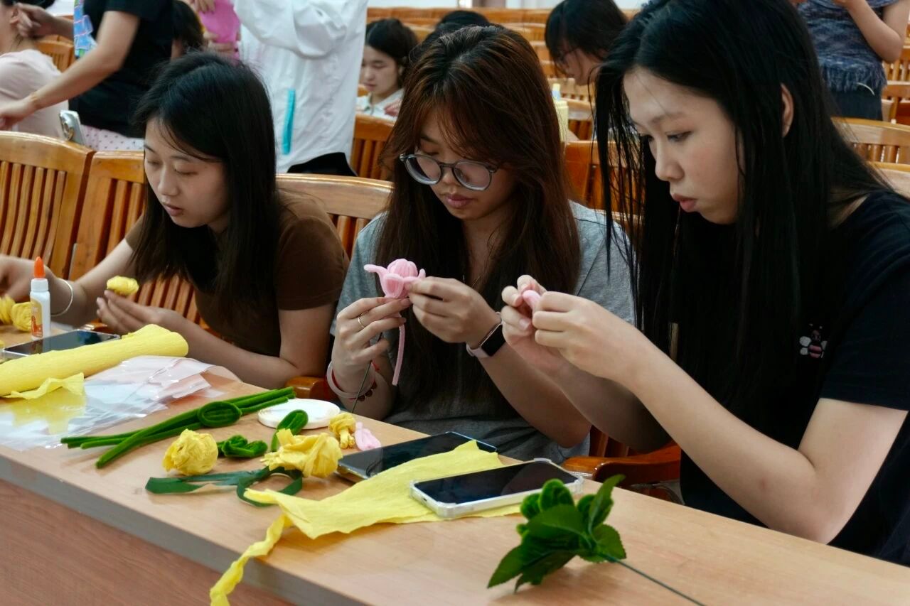 理论学习后,手工实践环节温情开启。大家分组协作,以折纸、扭扭棒为材料,指尖翻飞间,亲手制作出各式手工花艺作品,将对先辈的追思与敬意融入其中。现场氛围温馨治愈,大家互帮互助、交流分享,在动手实践中体悟清明文化内涵,把缅怀之情转化为奋进力量,让青春在文化传承中绽放光彩。