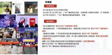 毕业生李惠敏现为广东广播电视台触电新闻主编,获得多项广东省新闻奖