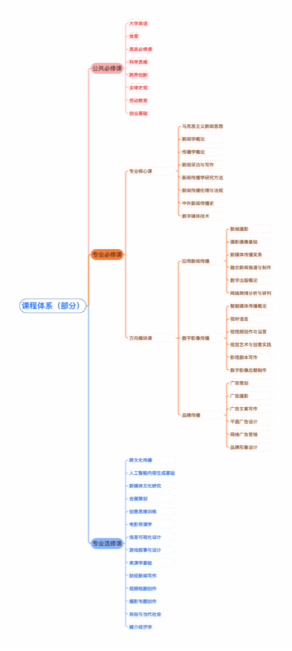 专业提供应用新闻传播、数字影像传播、品牌传播三大方向模块课程供学生修读,模块课程包括新媒体传播实务、融合新闻学、短视频制作与传播、数字影像后期制作、媒介经营与管理、网络广告营销等。除此之外,还有丰富多元的特色课程可供选修,例如民俗与当代社会、虚拟演播厅实务、 跨文化传播、人工智能内容生成基础、 游戏叙事与设计、出镜报道等。